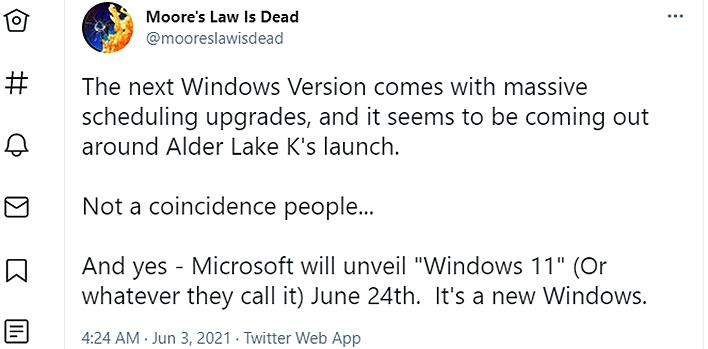 “下一个 Windows 版本带有大规模的日程安排升级,它似乎是在 Alder Lake K 发布前后发布的。这不是巧合的人……,”同一泄密者在另一条推文中表示。“是的 – 微软将在 6 月 24 日推出‘Windows 11’(或他们称之为的任何名称)。这是一个新的 Windows。”