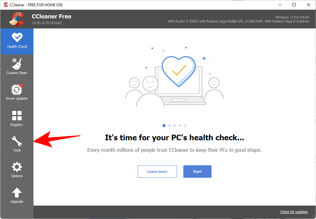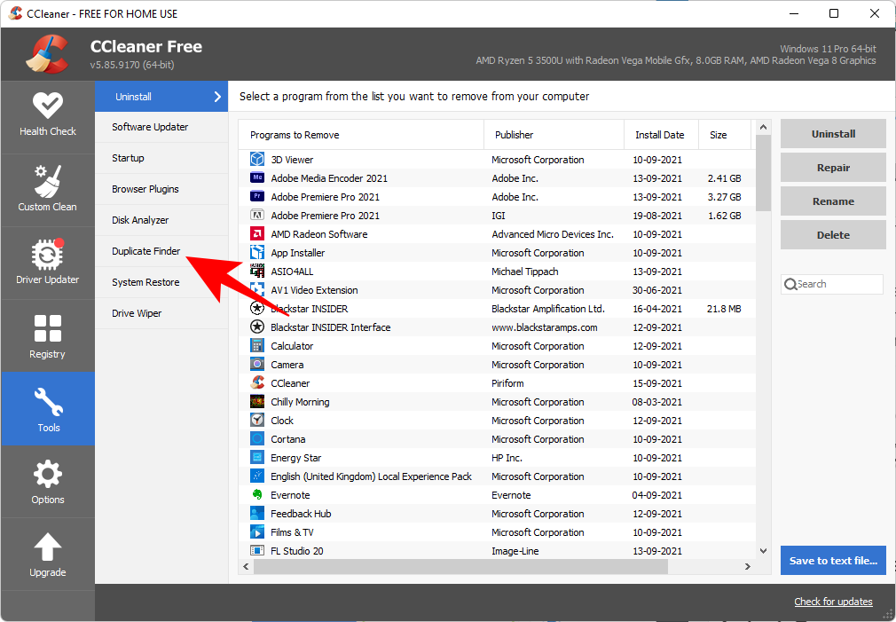 CCleaner 仍然是目前最流行的工具之一,它具有多合一功能,包括“重复查找器”。打开应用程序并单击左侧面板中的工具 选项。