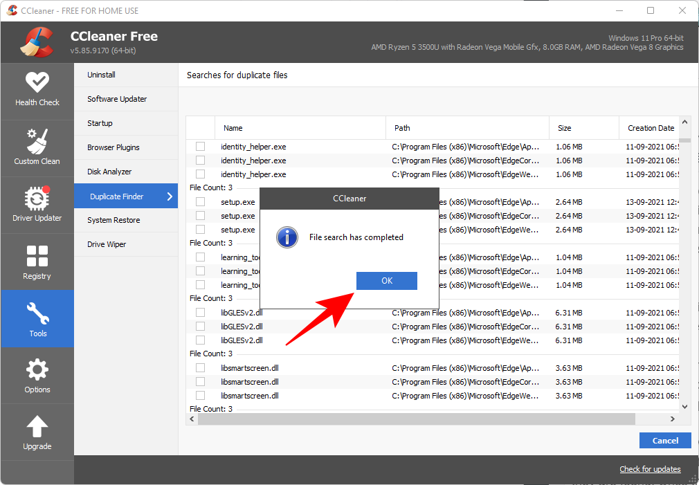 CCleaner 现在将开始搜索并显示找到的重复文件。搜索完成后,单击“确定”。