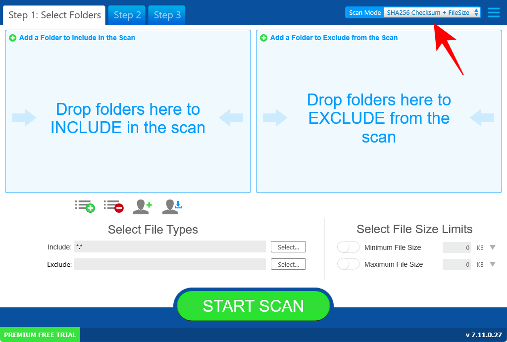 按文件大小限制搜索的选项位于右下角。建议将事物设置为默认值。然后将要扫描的文件夹拖放到左侧方块中。指定设置后,单击“开始 扫描”。