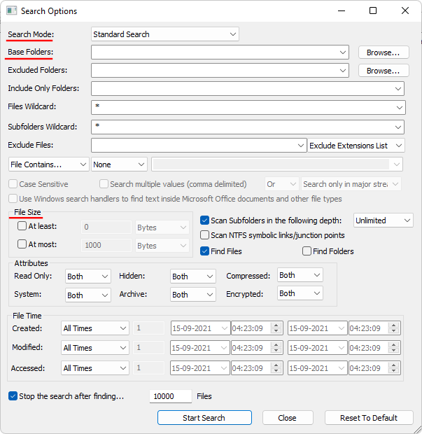 除了包含/排除文件夹和子文件夹以及文件大小范围的普通选项外,您还可以通过基于文件属性、创建日期、修改日期和访问日期的搜索选项进一步缩小搜索范围。