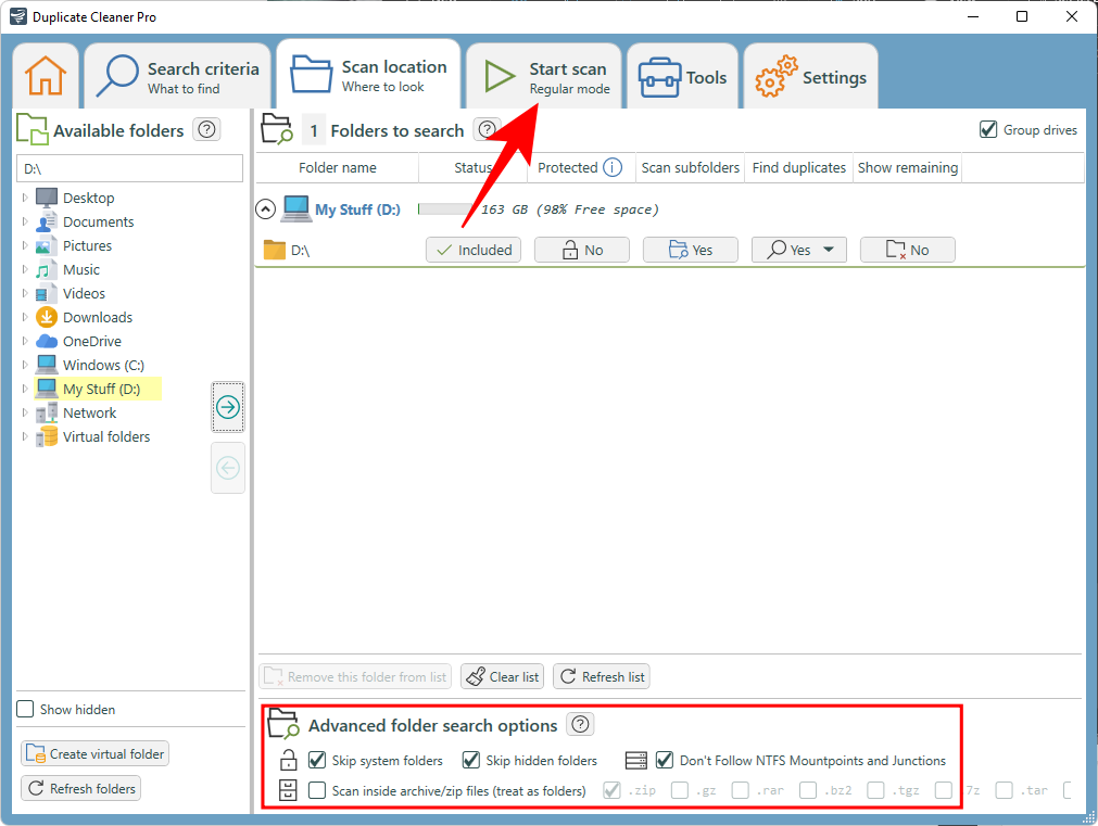 底部提供了高级文件夹搜索选项。对设置感到满意后,单击 顶部的开始扫描。