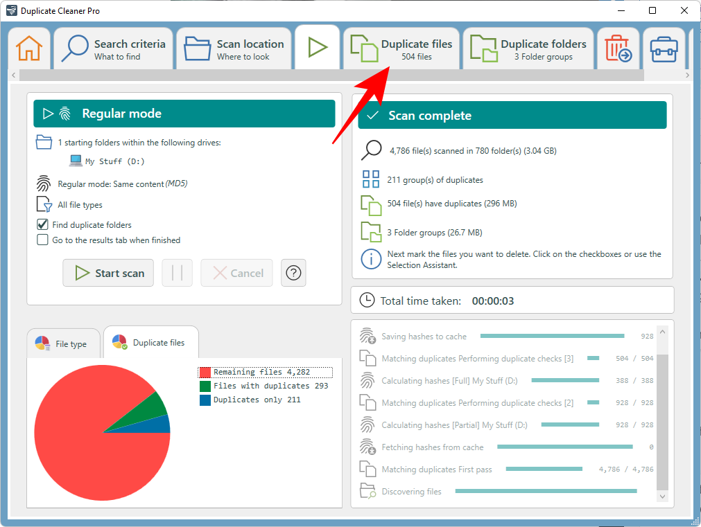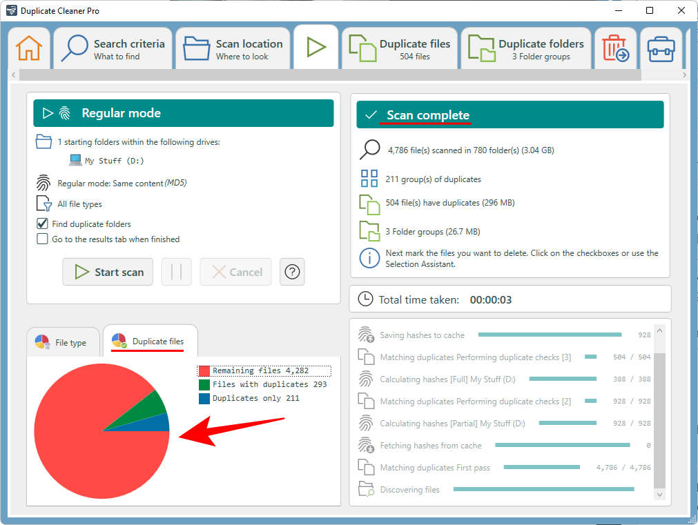 扫描完成后,您将看到扫描的详细信息以及左侧重复文件类型的图形表示。