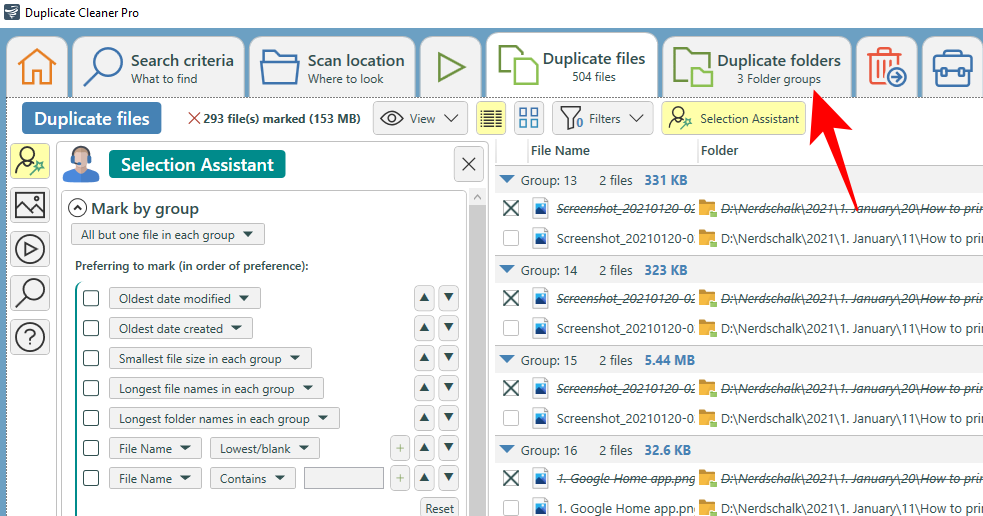 查看如何在每个组中标记重复文件夹。满意后,单击顶部的垃圾桶图标。