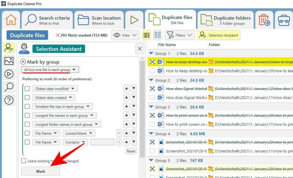 您会发现重复的文件是按组组织的,选择文件的选项位于左侧。默认情况下,“按组标记”选项设置为“每组中除一个文件外的所有文件”。这是推荐的选项,因为它将标记要删除的重复项并保持原件完好无损。单击标记 继续。