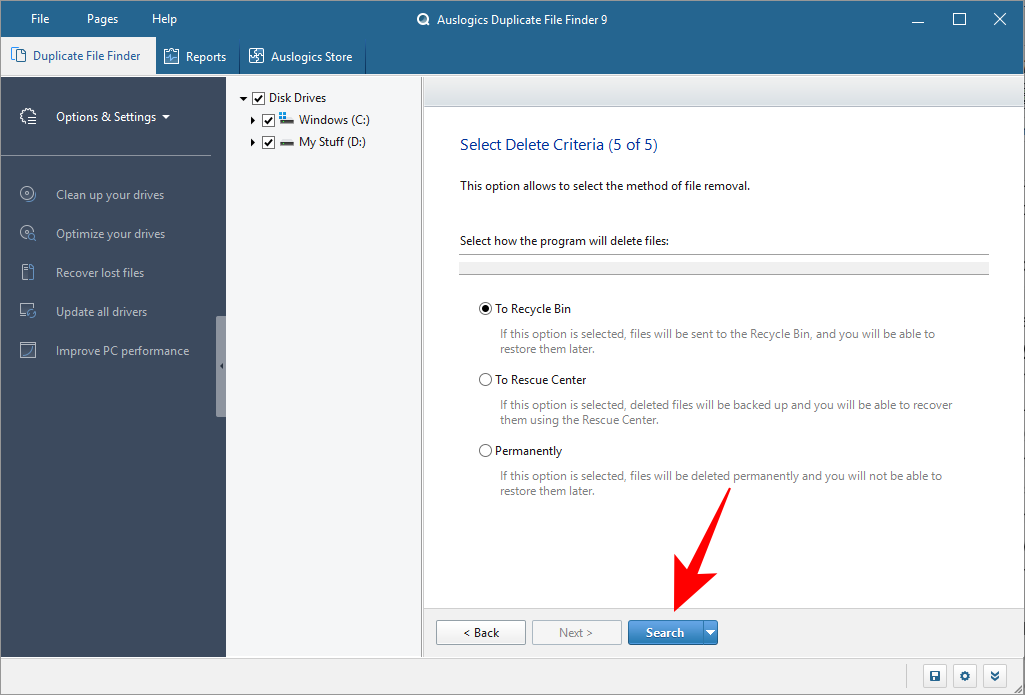 最后一个屏幕让您选择程序将如何删除文件,是将它们放入“回收站”、备份文件、删除它们并允许通过“救援中心”恢复,还是“永久”删除它们。完成搜索设置后,单击“搜索”。