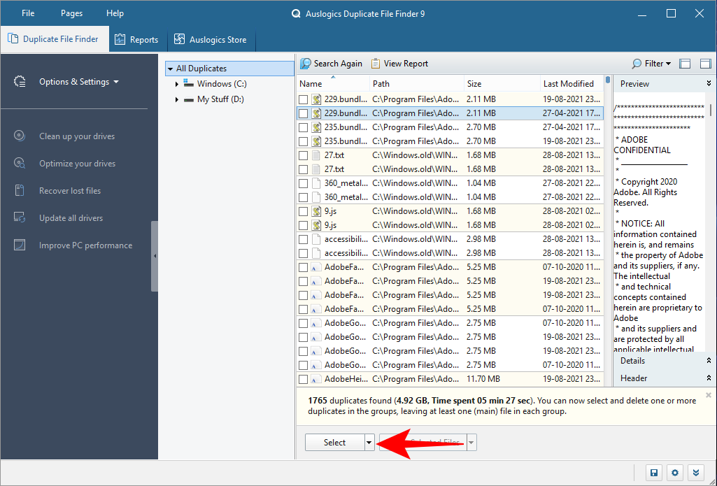 根据系统上的文件数量和搜索设置,这可能需要一些时间。搜索完成后,您将找到文件及其副本的列表。要仅选择重复项,请单击底部“选择”旁边的箭头。