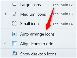 将出现一个子菜单,显示几个不同的图标视图选项。在此菜单上有一个名为“自动排列图标”的选项。顾名思义,此功能允许 Windows 自动排列您的图标。为防止发生这种情况,请取消选中“自动排列图标”选项。