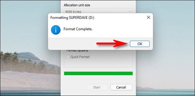 当 Windows 格式化磁盘时,您会看到一个绿色的进程指示器从左向右移动。当它完全填满时,格式将完成,您将看到一个警告弹出窗口。单击“确定”。