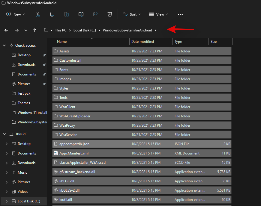 将所有选定的文件复制到我们之前创建的新“WindowsSubsystemForAndroid”文件夹中。