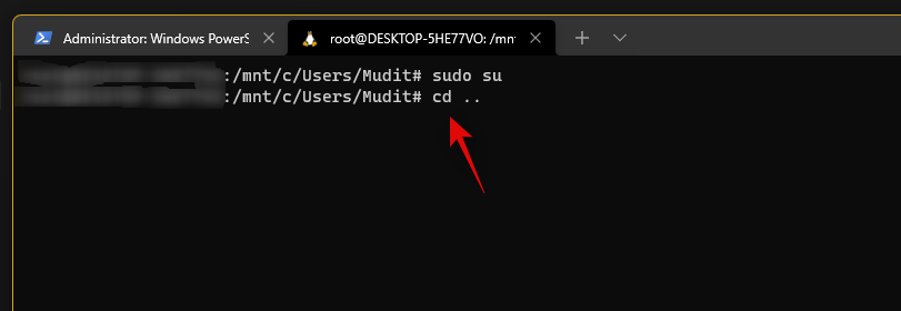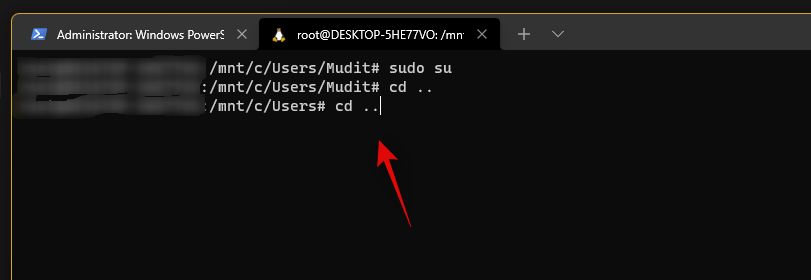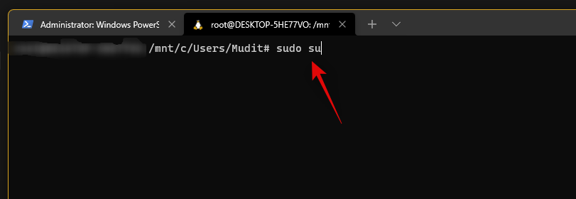 单击顶部的下拉箭头并选择相同的选项以在新选项卡中启动 WSL 终端。我们现在需要 root 访问权限才能使用 GApps 修改您的 WSA。输入以下命令,然后按键盘上的 Enter。如果您没有设置用户名或密码,那么您应该已经在终端中拥有 root 访问权限。您可以跳过此步骤并转到下一个步骤。