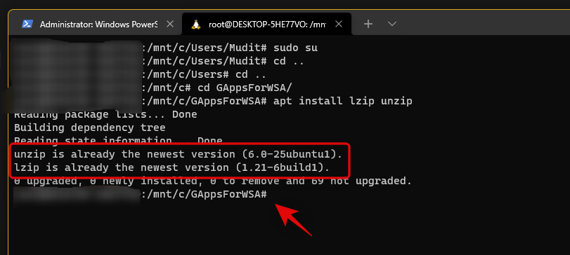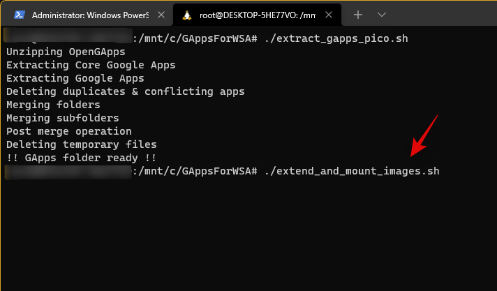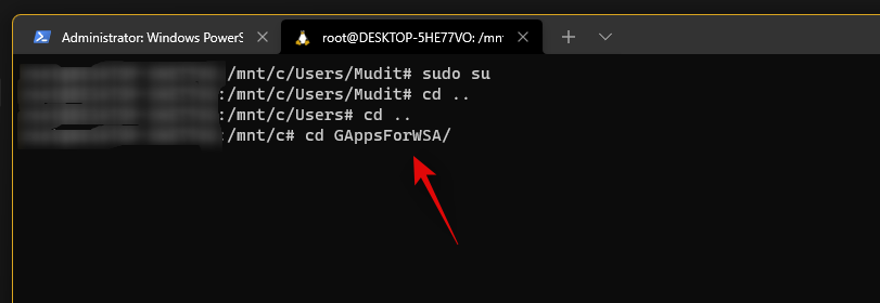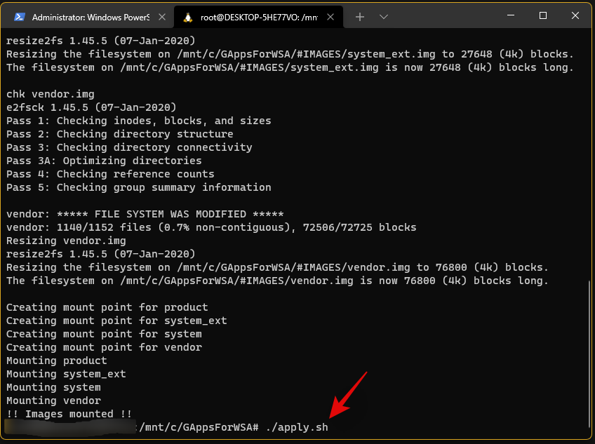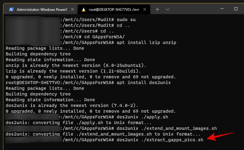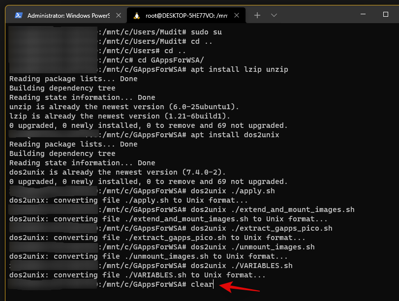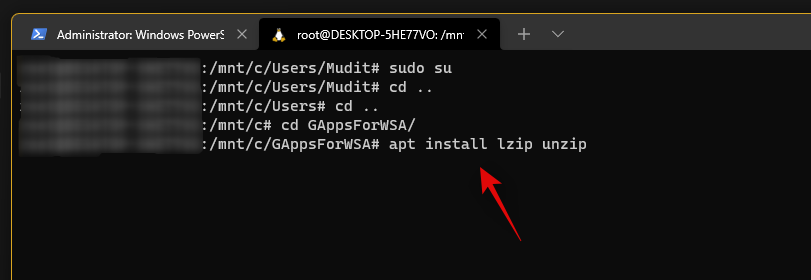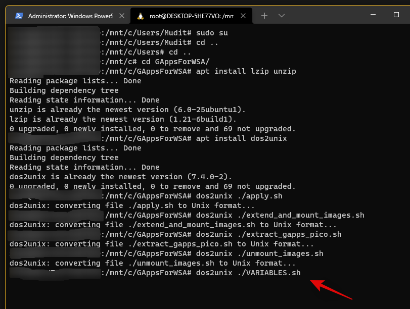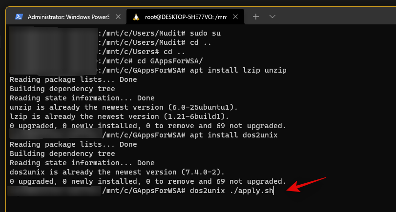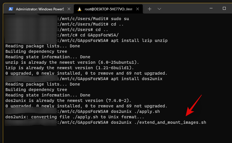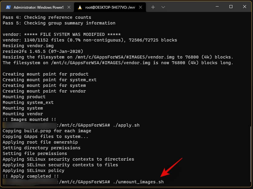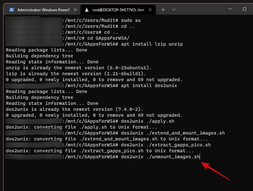 现在是时候修改您的 WSA 映像了。在终端中按照相同的顺序依次输入并执行以下命令。