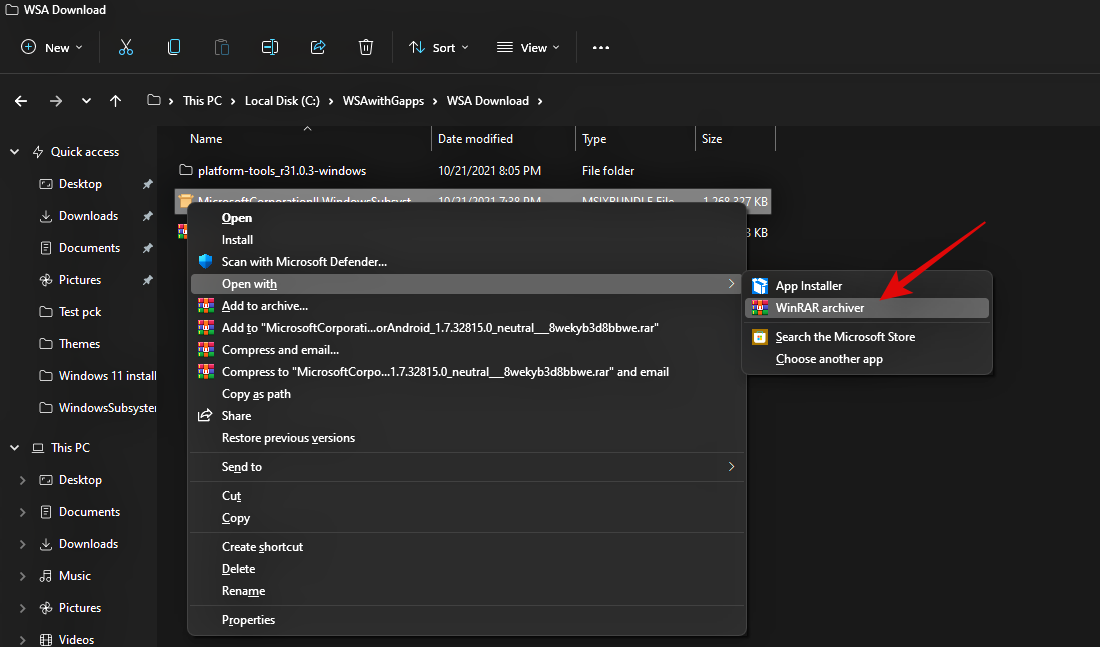 双击并在 WinRAR 中打开相同的包。完成后,转到 C/boot 驱动器并创建一个名为“WindowsSubsystemForAndroid”的新文件夹。