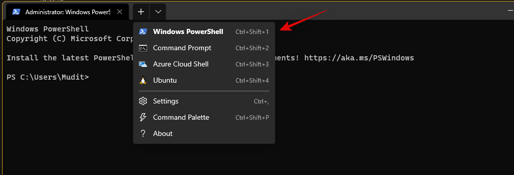 单击顶部的下拉箭头并选择“Windows Powershell”。