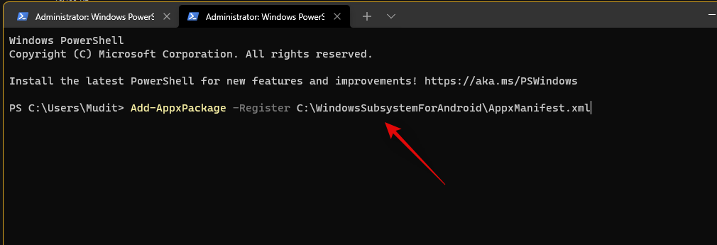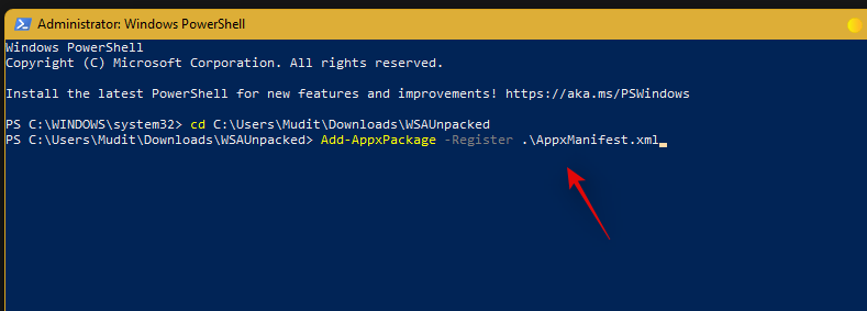 Add-AppxPackage -Register C:\WindowsSubsystemForAndroid\AppxManifest.xml