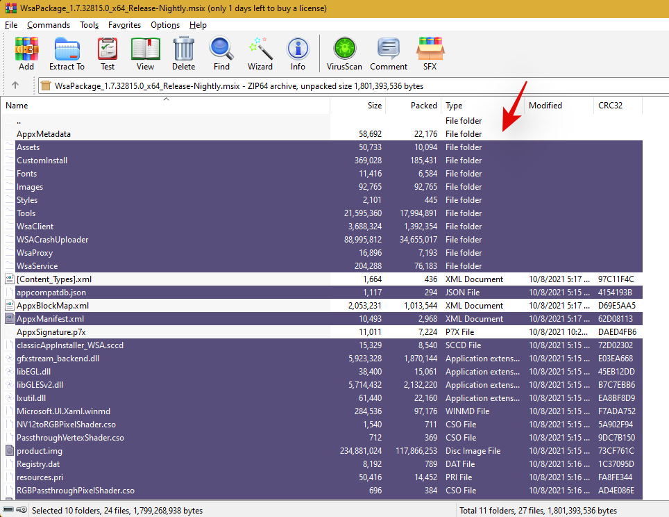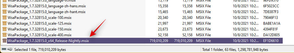 在 WinRAR 中打开包后,滚动到底部并检查 .msix 包的架构。它应该与您的 CPU 架构相匹配,如果不匹配,您可以从列表中选择所需的版本并继续阅读指南。