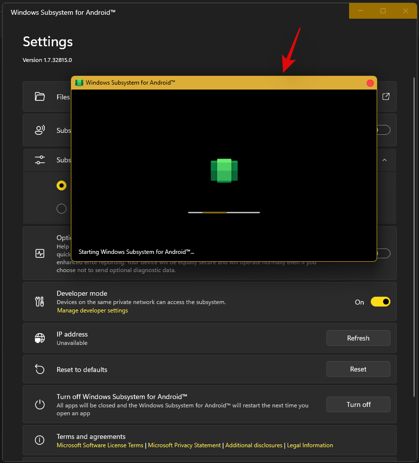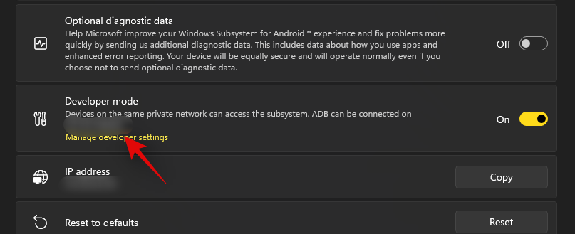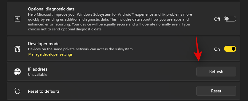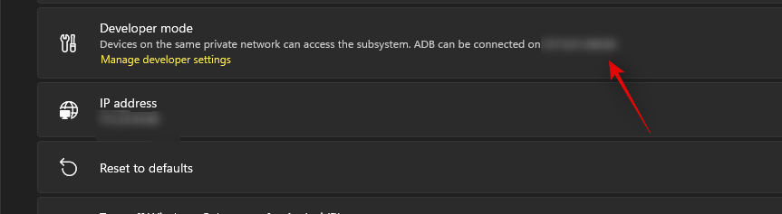 返回 Android 子系统并记下“开发人员模式”下方显示的地址。