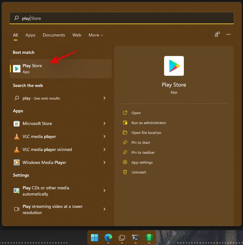 您现在可以关闭桌面上打开的所有窗口。现在按Windows + S并搜索“Play 商店”。一旦应用程序出现在您的搜索结果中,单击并启动该应用程序。