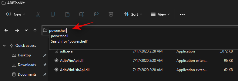 返回“ADBToolkit”文件夹并单击顶部的地址栏,输入“Powershell”并按键盘上的 Enter。