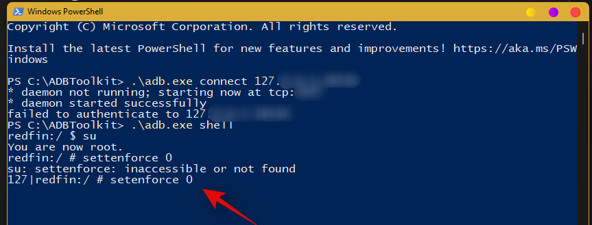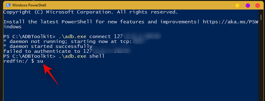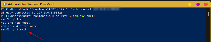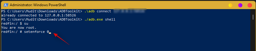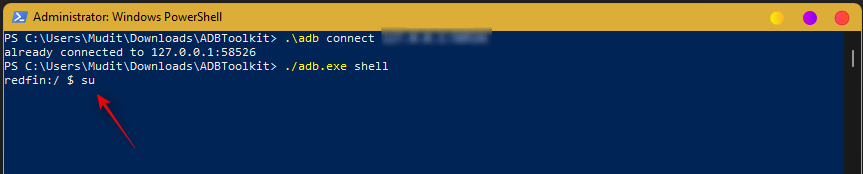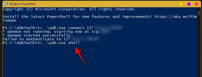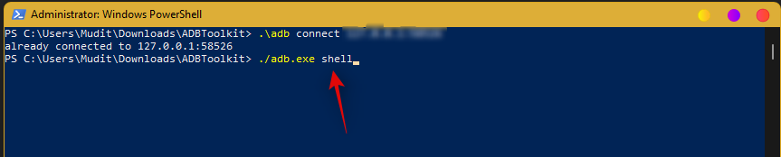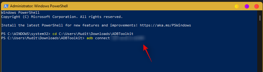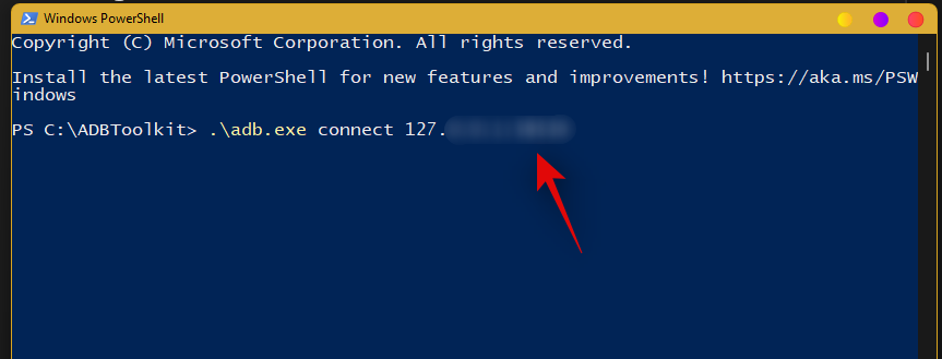 执行下面给出的命令来启动和连接 ADB。将“地址”替换为复制到剪贴板的地址(从上面)。