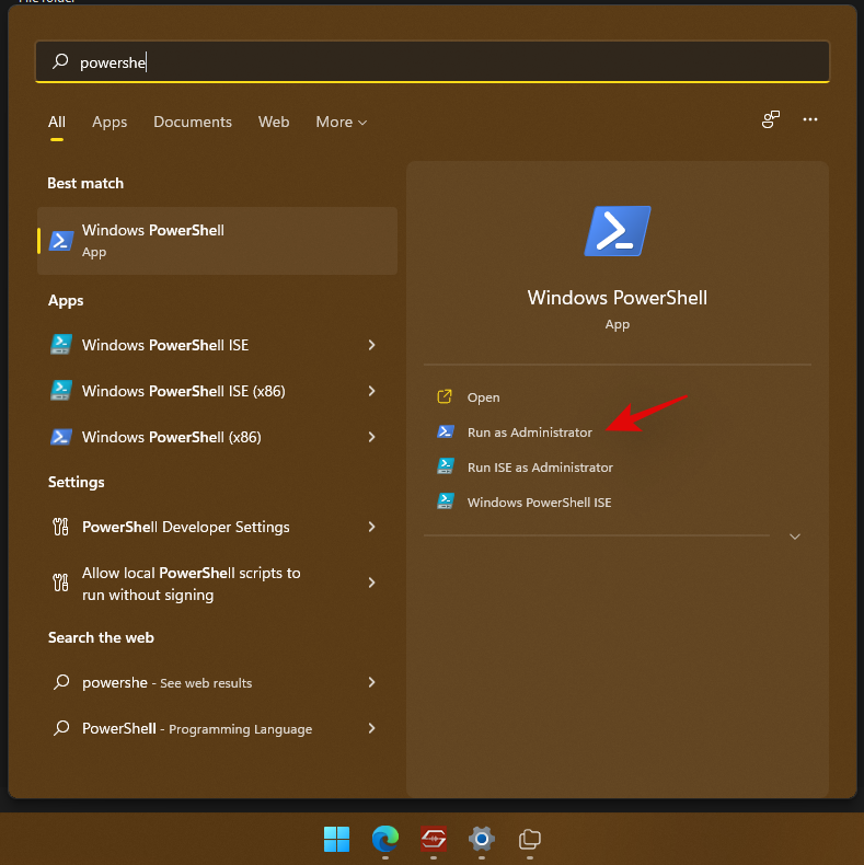 按下Windows + S键盘并搜索 Powershell。一旦 Powershell 出现在您的搜索结果中,单击“以管理员身份运行”。