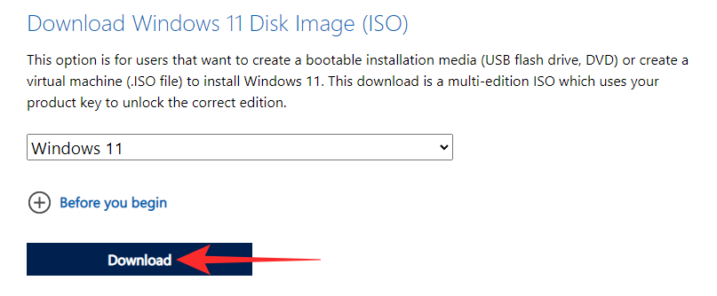 首先,单击此链接转到 Windows 11 ISO 下载页面。单击“下载”按钮以获取 ISO 文件。