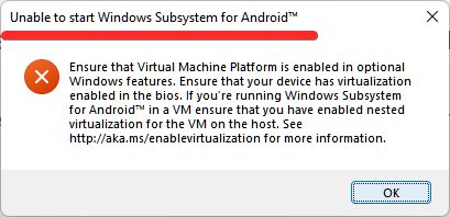 除非您解决该问题,否则您将无法在 Windows 11 计算机上运行 Android 应用程序。查看以下部分以了解有关在 Windows 11 上启用虚拟化的信息。