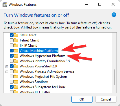 现在,在此处启用“虚拟机平台”和“Windows 管理程序平台”功能,然后单击“确定”。