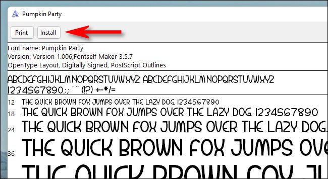 Windows 将在特殊字体预览窗口中打开字体示例。单击“安装”以安装字体。这将自动将字体文件移动到您的 Windows 系统字体文件夹(C:\Windows\Fonts默认情况下)。