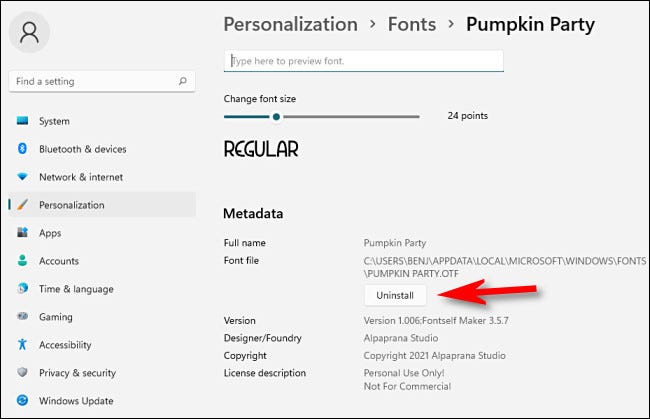 Windows 将从您的系统中删除该字体。如果您需要删除更多字体,请在“设置”>“个性化”>“字体”中搜索它们并重复该过程。完成后,关闭设置。