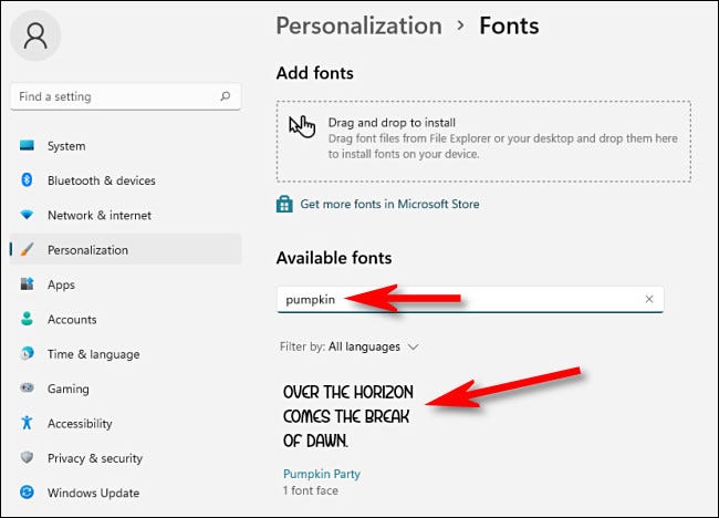 在字体设置中,您将在“可用字体”部分看到所有已安装字体的列表。要快速找到要卸载的字体(如果知道其名称),请单击“在此处键入以搜索框”,然后键入要删除的字体的名称。当它出现在列表中时,单击它。