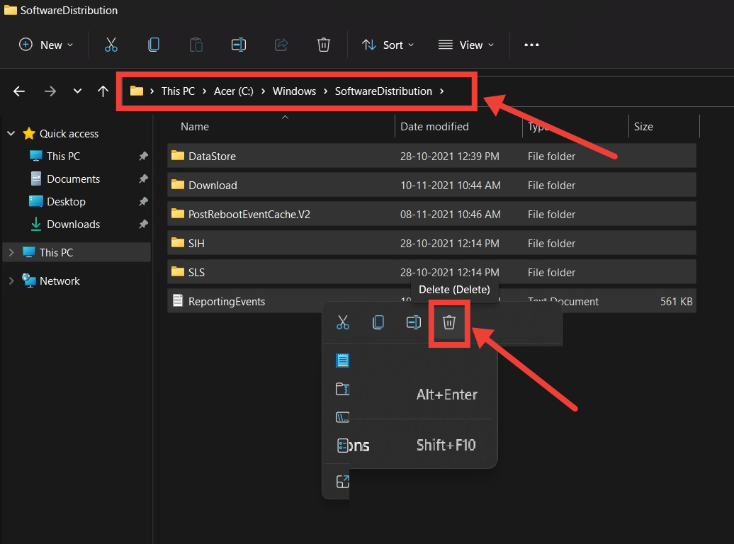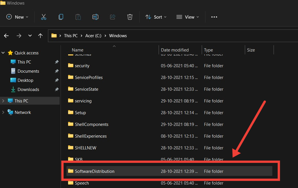 - 现在,打开Windows 文件资源管理器并将C:\Windows\SoftwareDistribution粘贴到地址栏中。