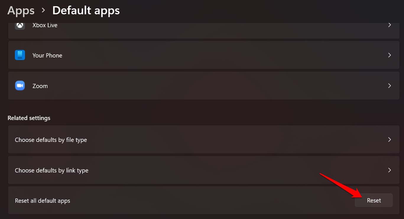 - 向下滚动到重置所有默认应用程序,然后单击重置。