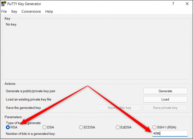 打开后,在窗口底部,您将看到要生成的各种类型的密钥。如果您不确定要使用哪个,请选择“RSA”,然后在“生成的密钥中的位数”输入框中输入“4096”。另一种选择是选择“EdDSA”,然后从其下方出现的下拉菜单中确保选择“Ed25519(255 位)”。