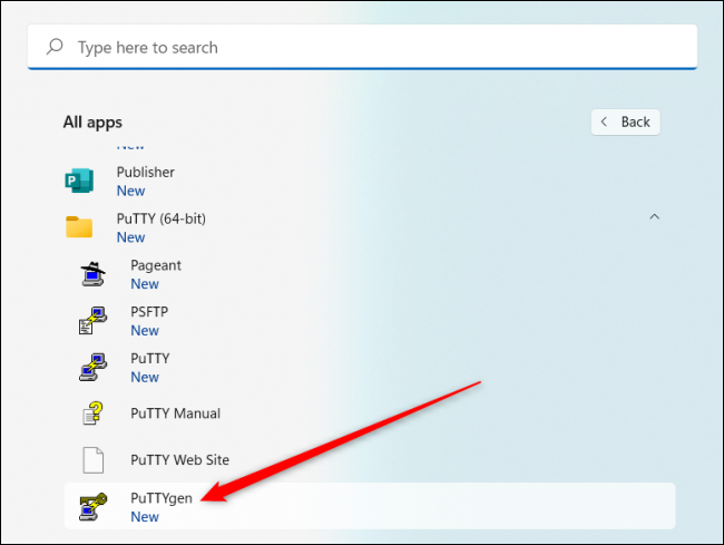 PuTTY 附带了许多帮助程序,其中之一称为 PuTTY 密钥生成器。要打开它,可以通过点击 Windows 键并输入“puttygen”来搜索它,或者在“开始”菜单中搜索它。