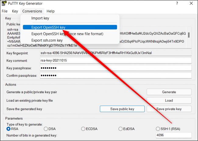 然后要获取您的私钥,还需要一个额外的步骤。默认情况下,PuTTY 会生成供 PuTTy 客户端使用的 PPK 密钥。但是,如果您需要 OpenSSH,请在窗口顶部选择转换 > 导出 OpenSSH 密钥,然后将文件另存为“id_rsa”或“id_ed25519”,没有文件结尾。