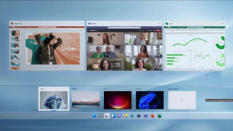 对虚拟桌面和多任务处理进行了改进,包括在早期版本中发现的窗口捕捉功能。虚拟桌面现在可以有单独的壁纸进行个性化,任务栏中的专用图标现在单独用于虚拟桌面,取代了 Windows 10 的时间线。