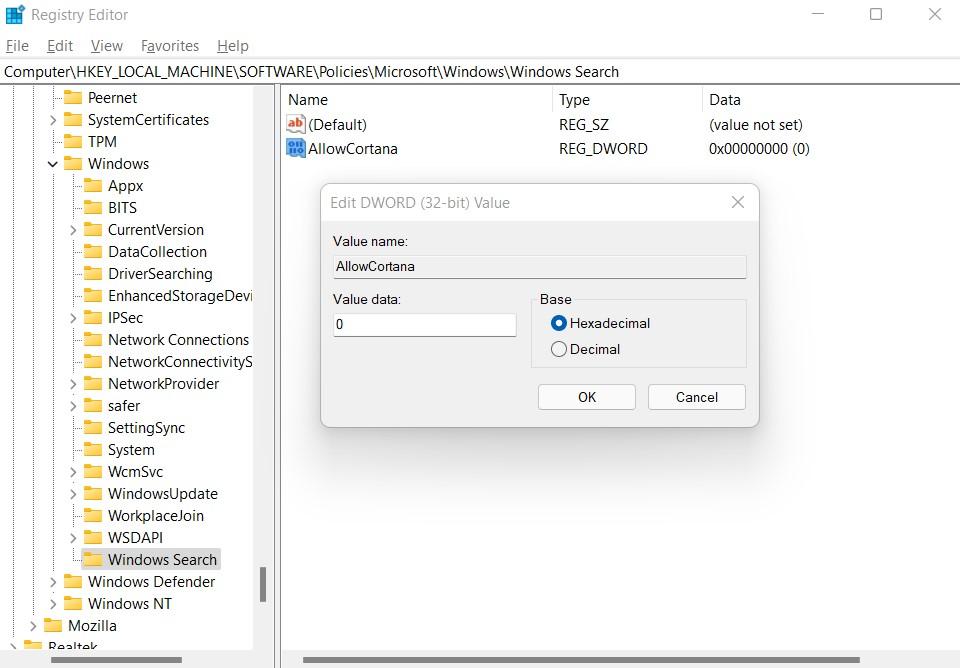 - 双击 AllowCortana 并将 Base 设置为Hexadecimal并将 Value 数据设置为0。点击确定。