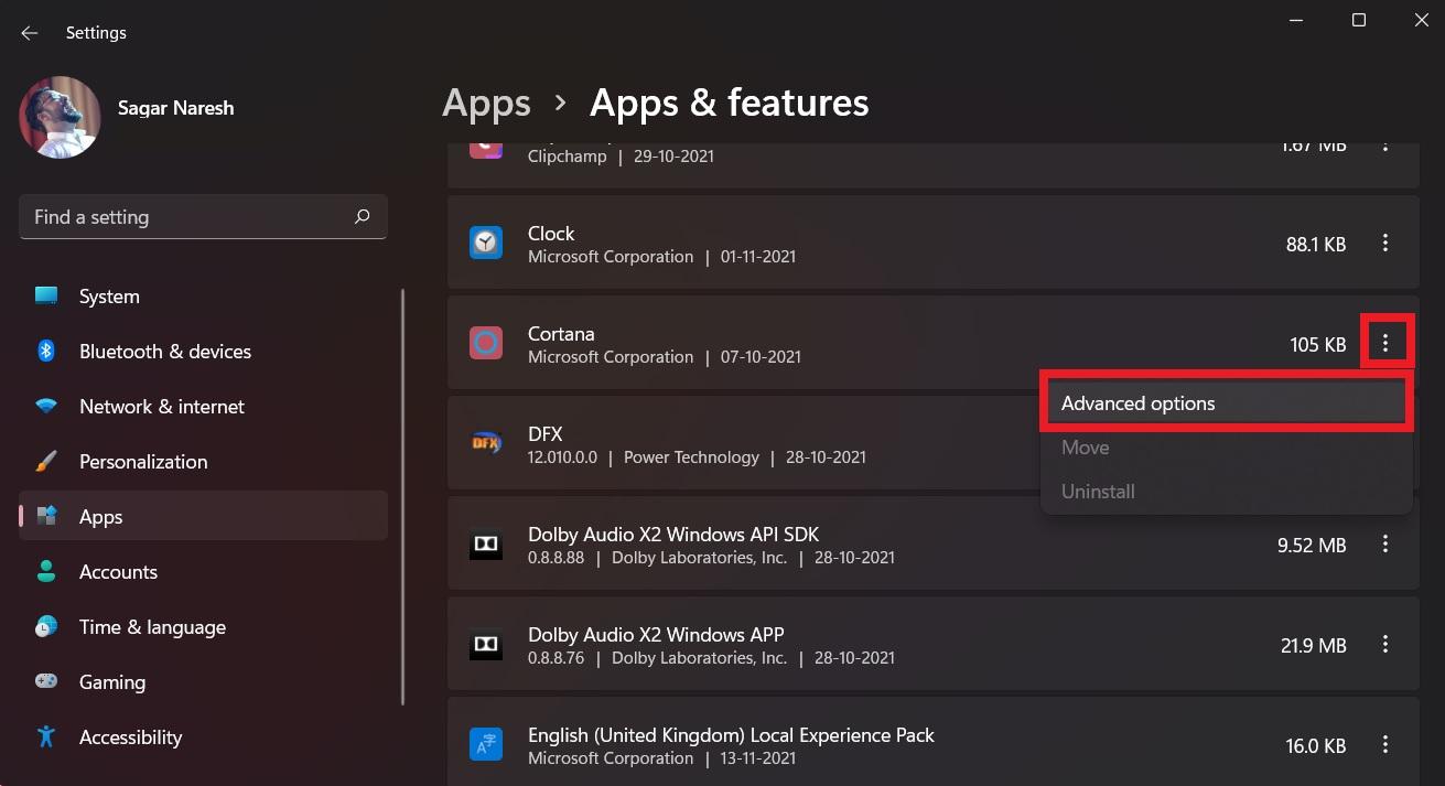 - 向下滚动应用程序列表,然后单击Cortana旁边的三点状图标,然后选择高级选项。