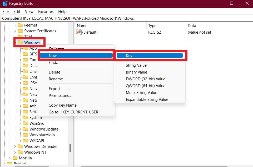 - 如果 Windows Search 文件夹不可用,请在Windows 目录下右键单击它,然后选择New > Key option。