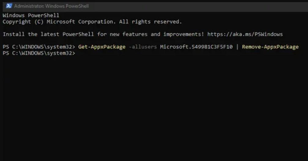 Get-AppxPackage -allusers Microsoft.549981C3F5F10 | Remove-AppxPackage