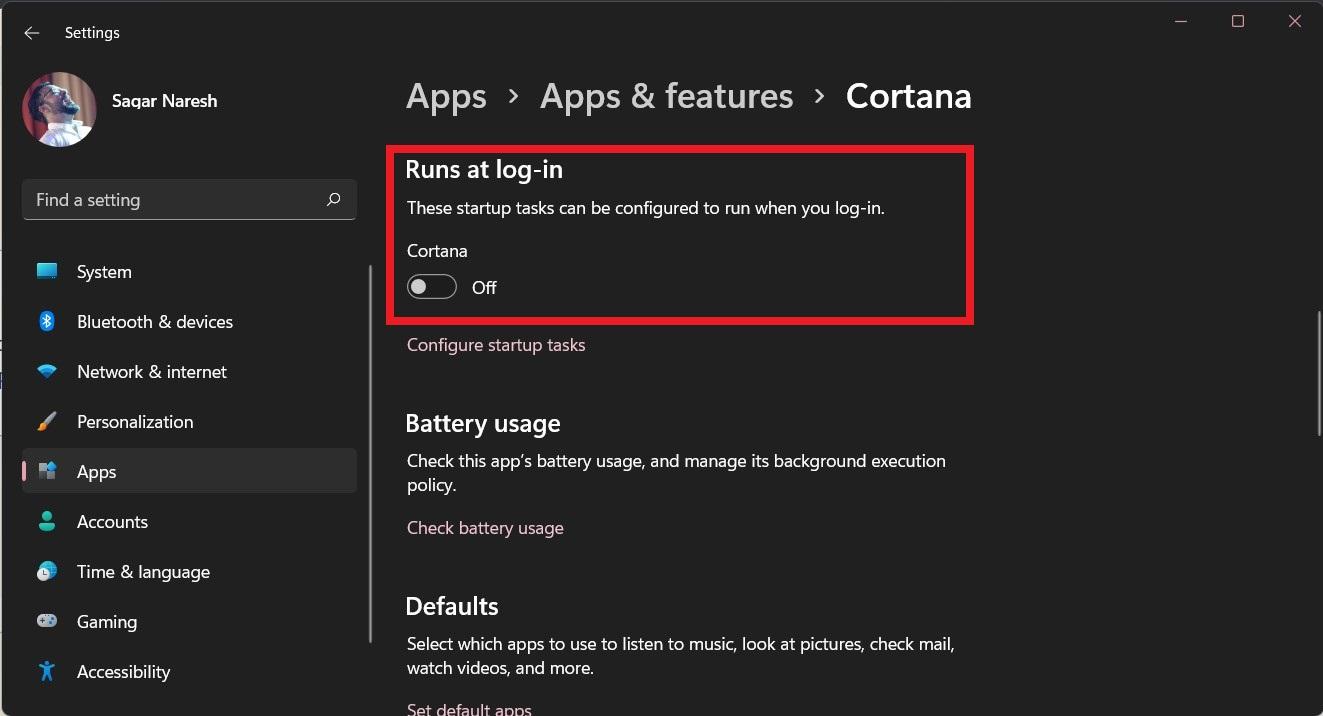 - 将打开一个新的 Cortana 应用程序页面。向下滚动并关闭登录选项中的运行。