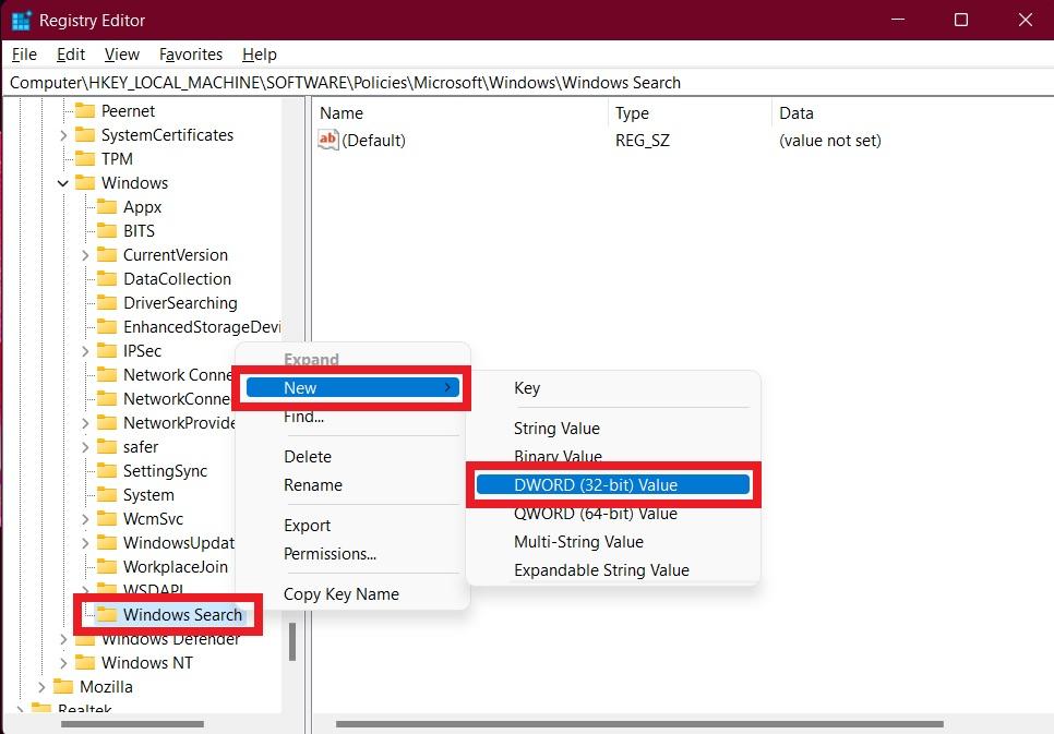 - 右键单击Windows Search文件夹并选择New > DWORD (32-bit) Value。