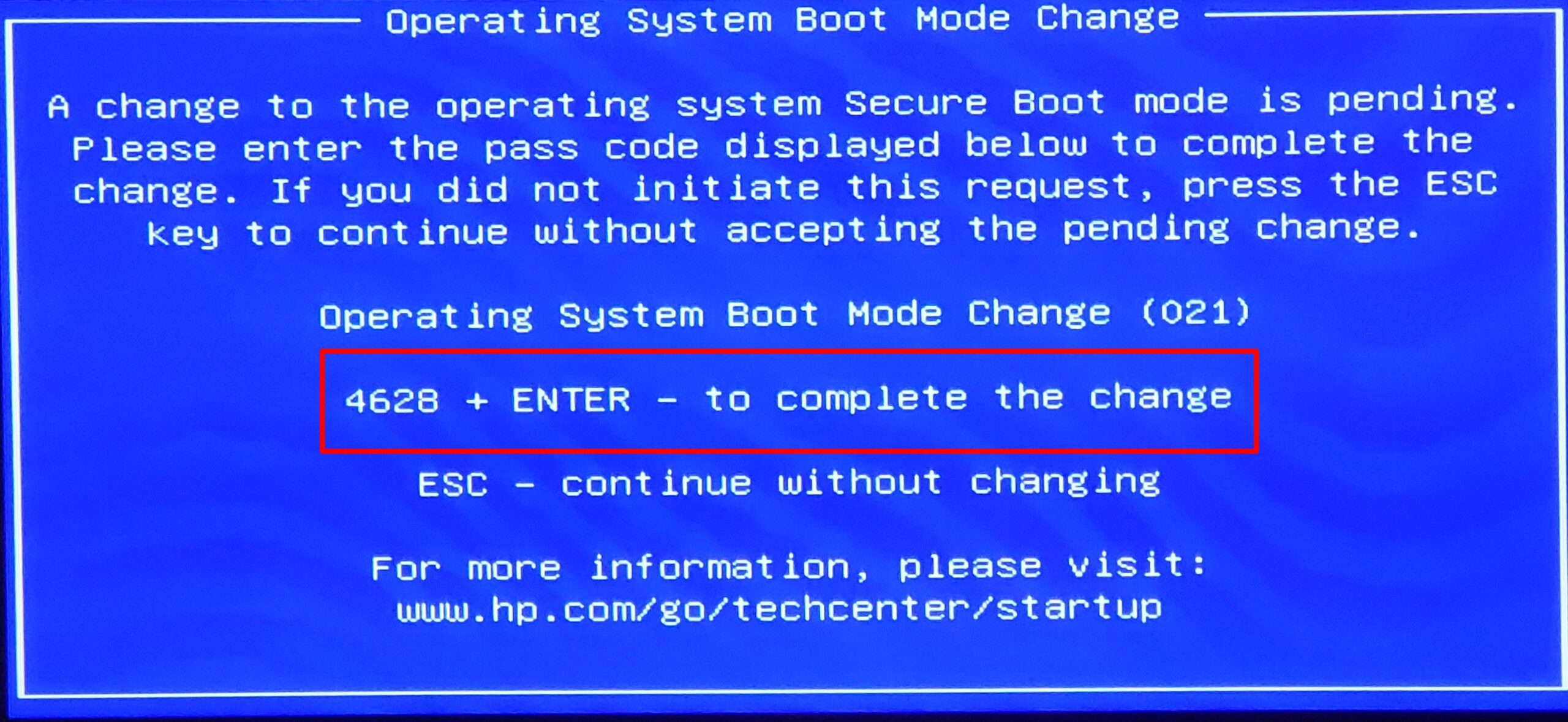 - 完成后,重新启动 PC,您应该会看到操作系统启动模式更改提示。输入请求的代码并按 Enter 以验证您对 BIOS 所做的更改。