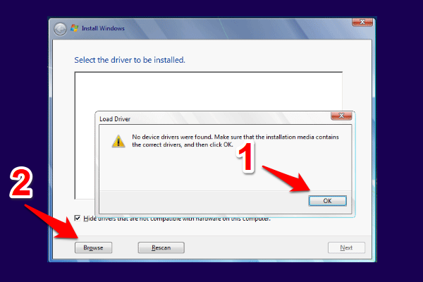 - 现在单击确定关闭错误消息。然后单击浏览,导航到第二个 USB 设备中的驱动程序文件,然后单击确定。