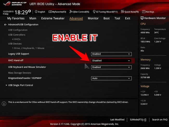 - 您现在应该会看到 BIOS xHCI Hand-Off 或 BIOS EHCI Hand-OFF 选项,将其状态更改为已启用。