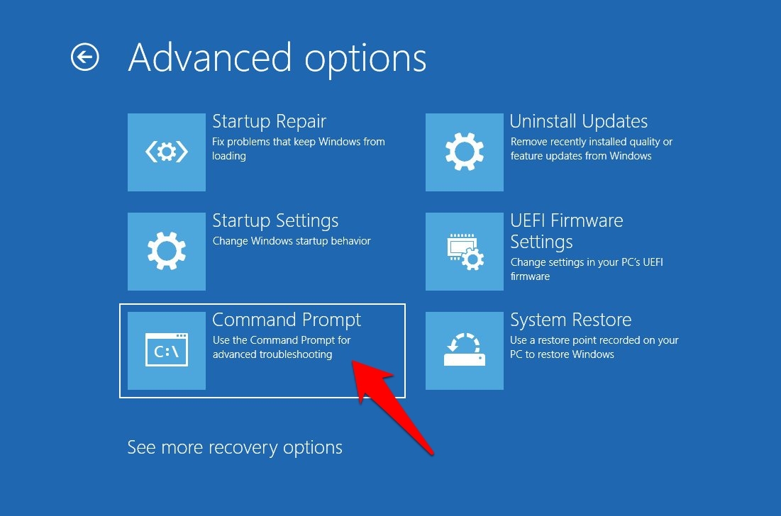 - 之后,单击高级选项,然后单击命令提示符。