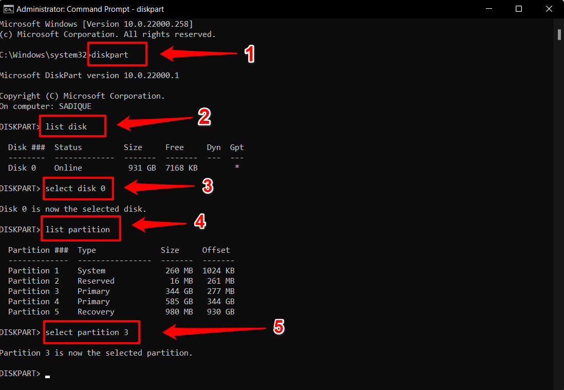 diskpart list disk select disk X list partition select partition X