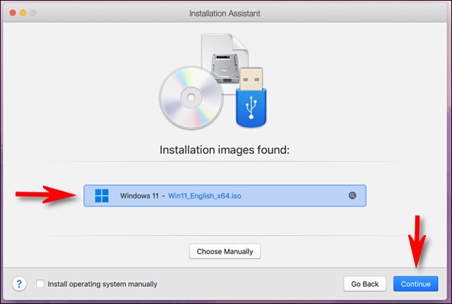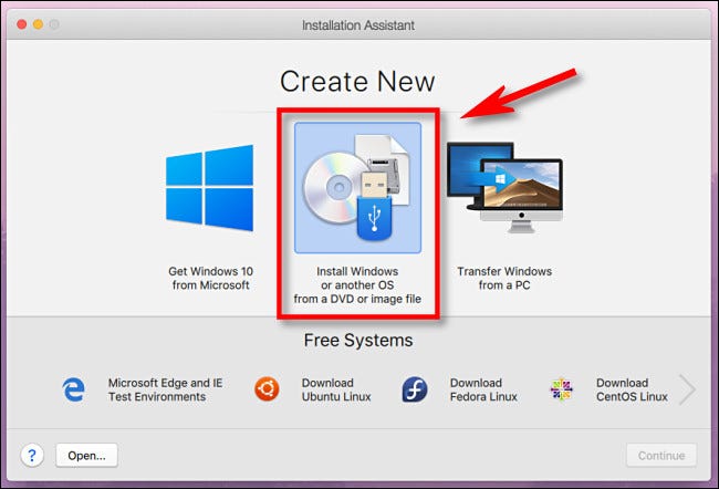 在 Intel Mac 上,打开安装助手并选择“从 DVD 或映像文件安装 Windows 或其他操作系统”,然后单击“继续”。