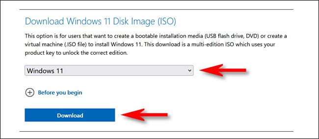 接下来,如果您运行的是 Intel Mac,请从 Microsoft 网站下载 Windows 11 ISO。在下载页面,找到“下载 Windows 11 磁盘映像 (ISO)”部分,在下拉菜单中选择“Windows 11”,然后单击“下载”。